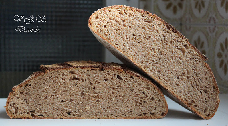 Painea de fata e o paine dulceaga, cu un miez putin umed si cu gauri ca la un fagure. Ceea ce m-a surprin pe mine cel mai mult, e ca aceasta paine a ajuns sa fie pe placul chiar si celor care nu vor sa vada paine integrala, cum ar fi sotul meu, dar in privinta acestei paini nu comenteaza nimic.